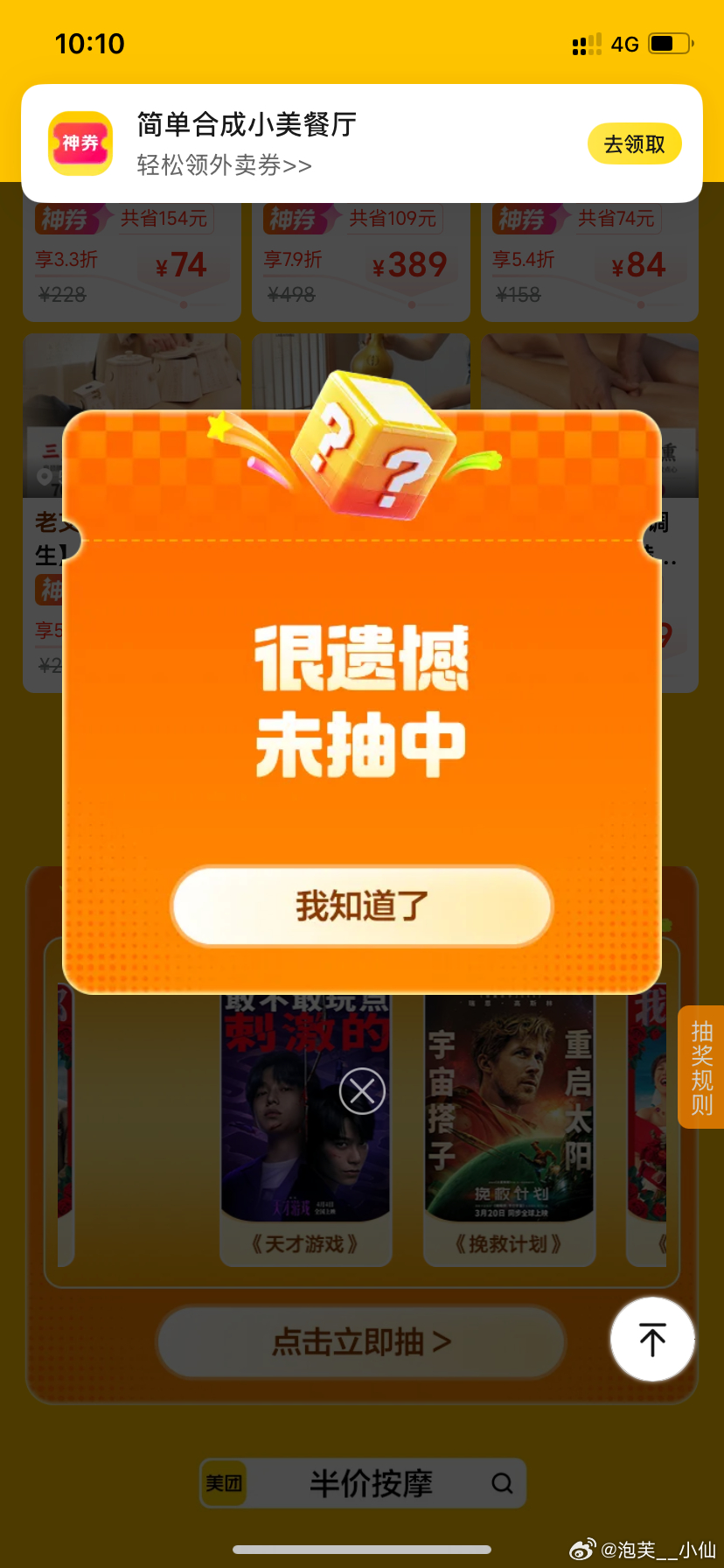 美团搜【半价按摩450】 下拉去试抽60电影票券哈...