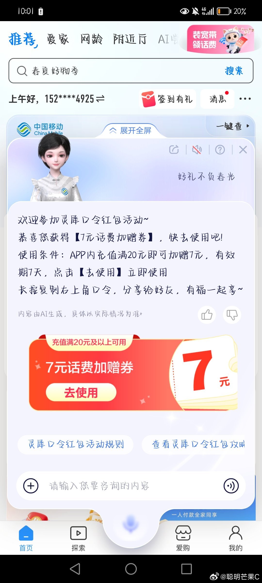 这个记得去 移动 αpp 如图底部中间 给 Ai 发:好礼不负春光 有抽随机话费加赠劵 ...