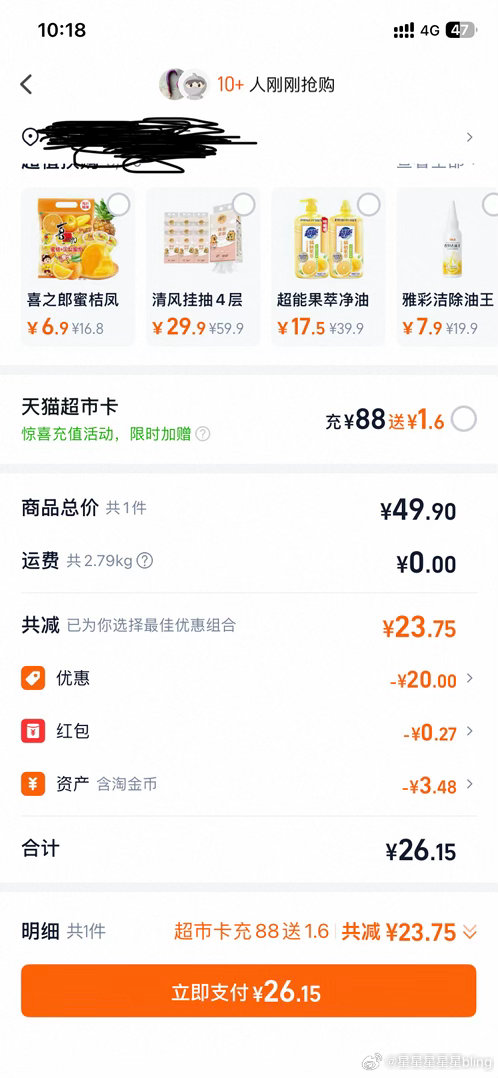 🐱超 清风悬挂式抽纸4层250抽10包选项,领礼金 详情页进入超市直播间领9折主播券,加购商品 淘金...
