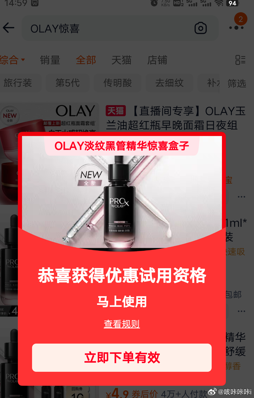 淘宝app搜【olay惊喜】 超哥刚刚申请了2000份库存 超哥也中了 你们去试试 ...