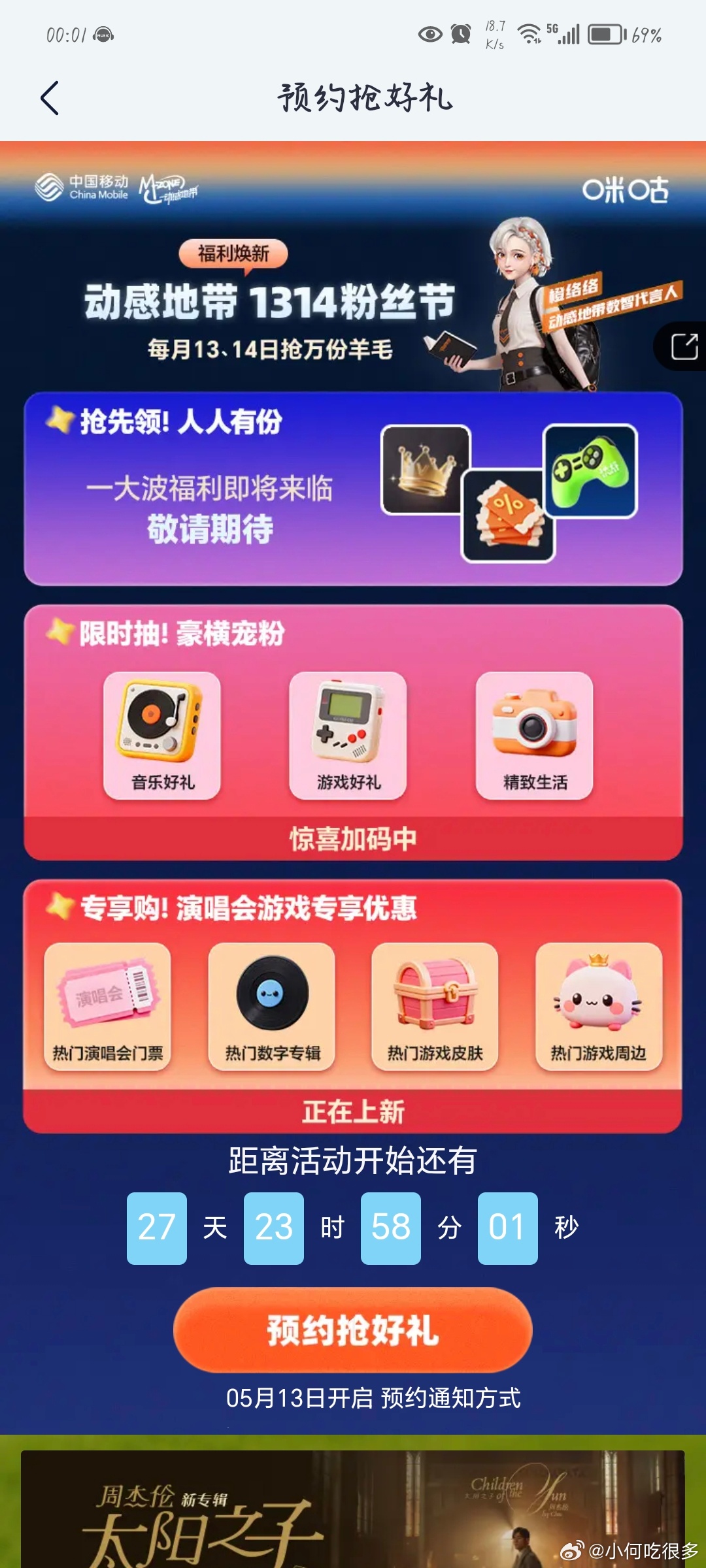 ⏰0点 咪咕音乐-顶部「1314」 或搜:感动地带1314粉丝节 需移动动感地带用户 先到先得 领6...