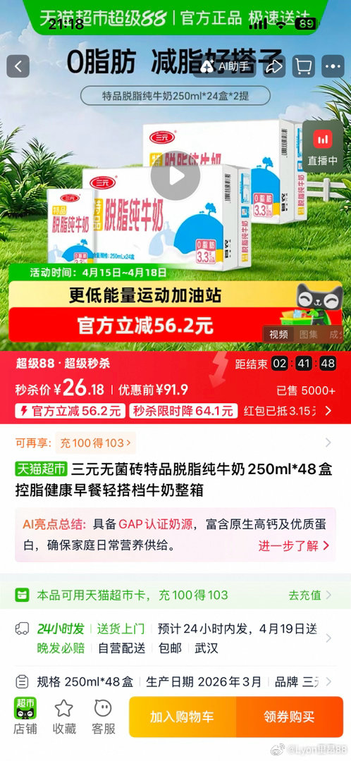 🐱超 三元纯牛奶全脂250ml*24+脱脂250ml*24 进入超级补贴领39-6红包,拍1件vip...