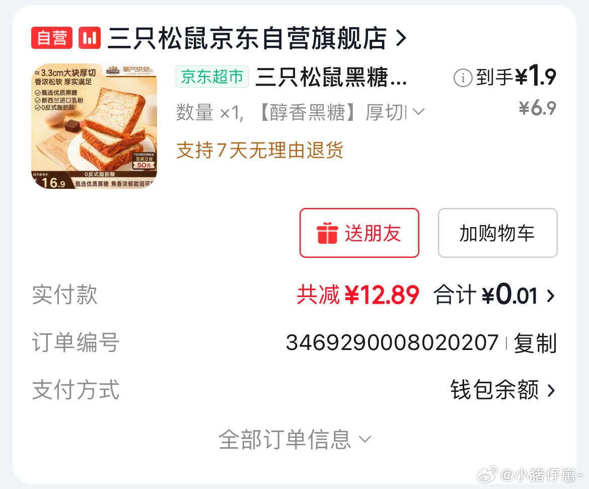 🐶东 地区价 三只松鼠手撕面包1.2kg礼盒装,9.9...