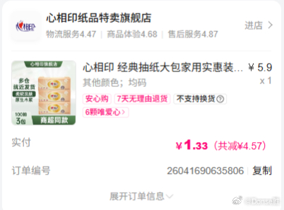 1.71💰3包心相印抽纸