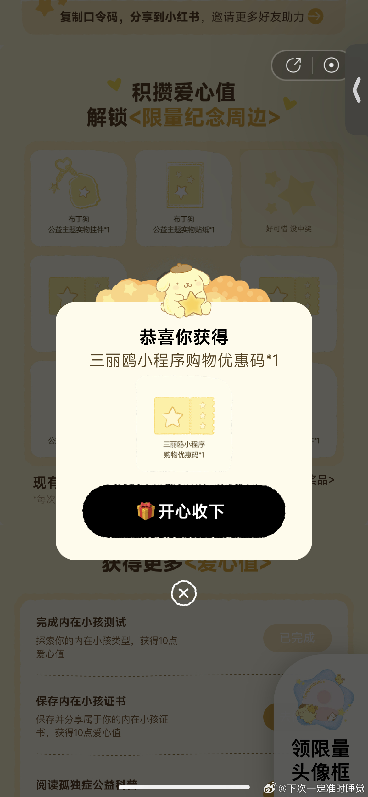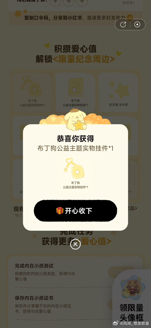 过号就行 实物反馈还不错 网易云音乐搜:拥抱内在小孩 可抽1w份布丁狗贴纸 和6.5k布丁狗挂件实物...