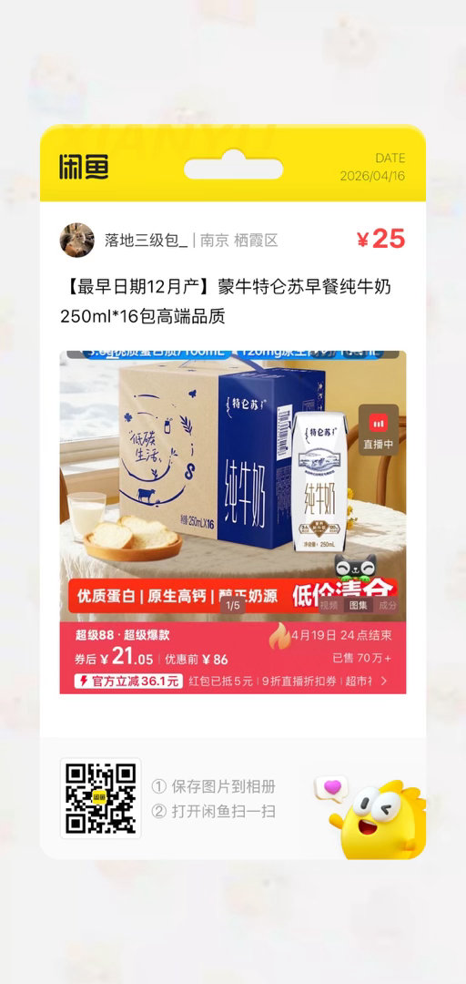 🐱超 部分地区有补贴20 蒙牛特仑苏早餐纯牛奶250ml*16包 右上角进入直播间领9折主播券,加购...