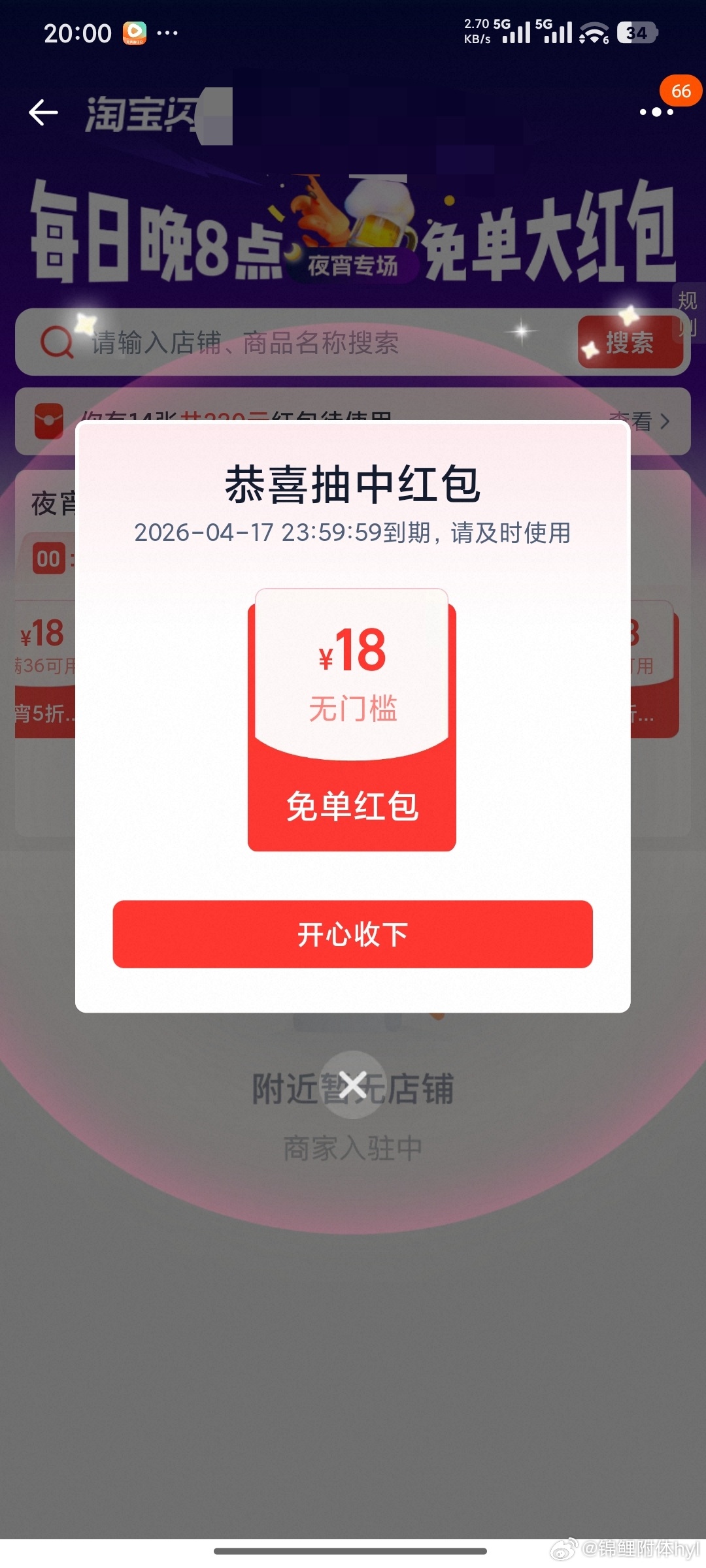 00分中的某宝夜宵18,累计中了31次(多号),上次中还是4/13[杀马特]