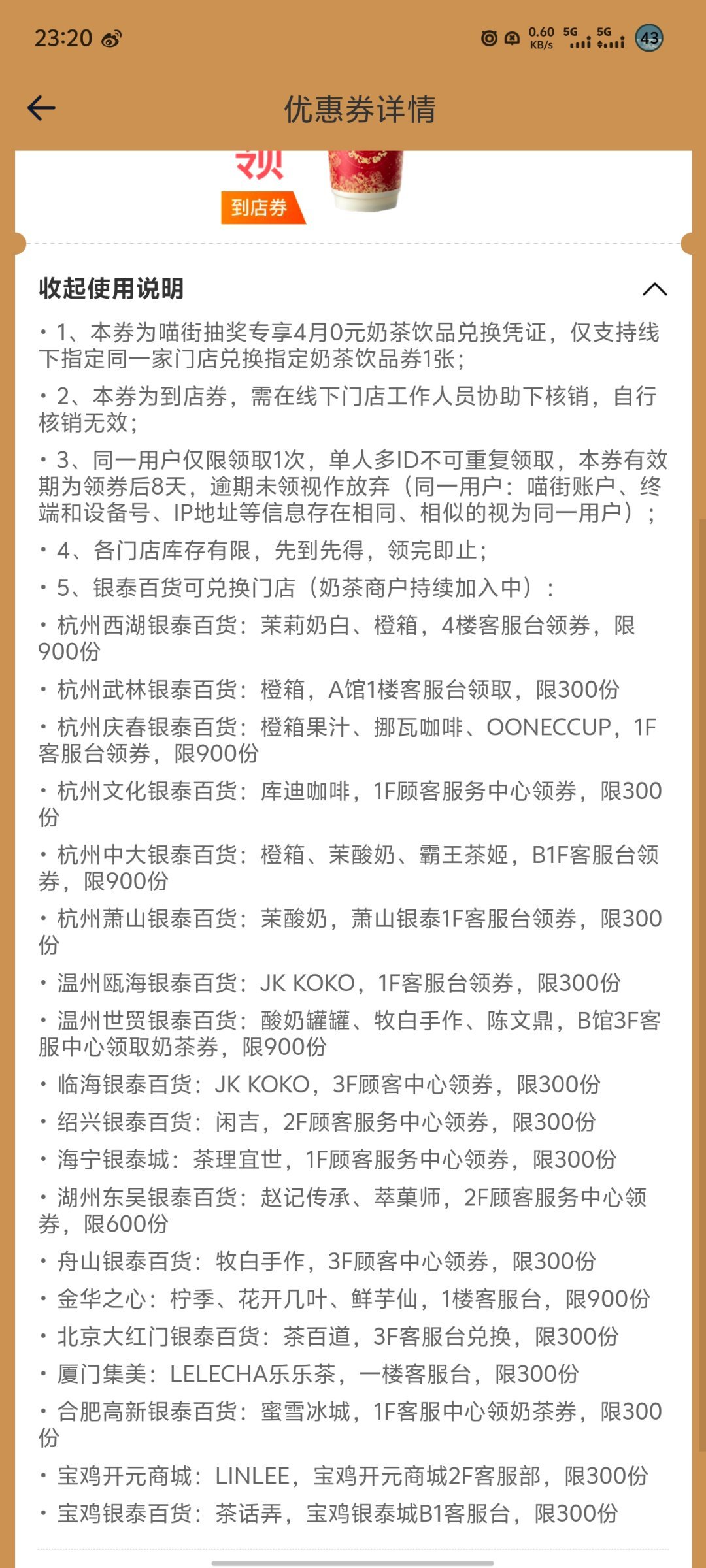 有没有以下地区的 免费送银泰奶茶 今天到期 线下兑换核销 ·杭州西湖,武林,庆春,文化,中大,萧山银泰 ·温州瓯海银泰,世贸银泰 ·临海银泰 ·绍兴银泰 ·海宁银泰城 ·湖州东吴银泰百货 ·舟山银泰百货 ·金华之心银泰 ·北京大红门银泰百货 ·厦门集美 ·合肥高新银泰百货 ·宝鸡开元商城 ·宝鸡