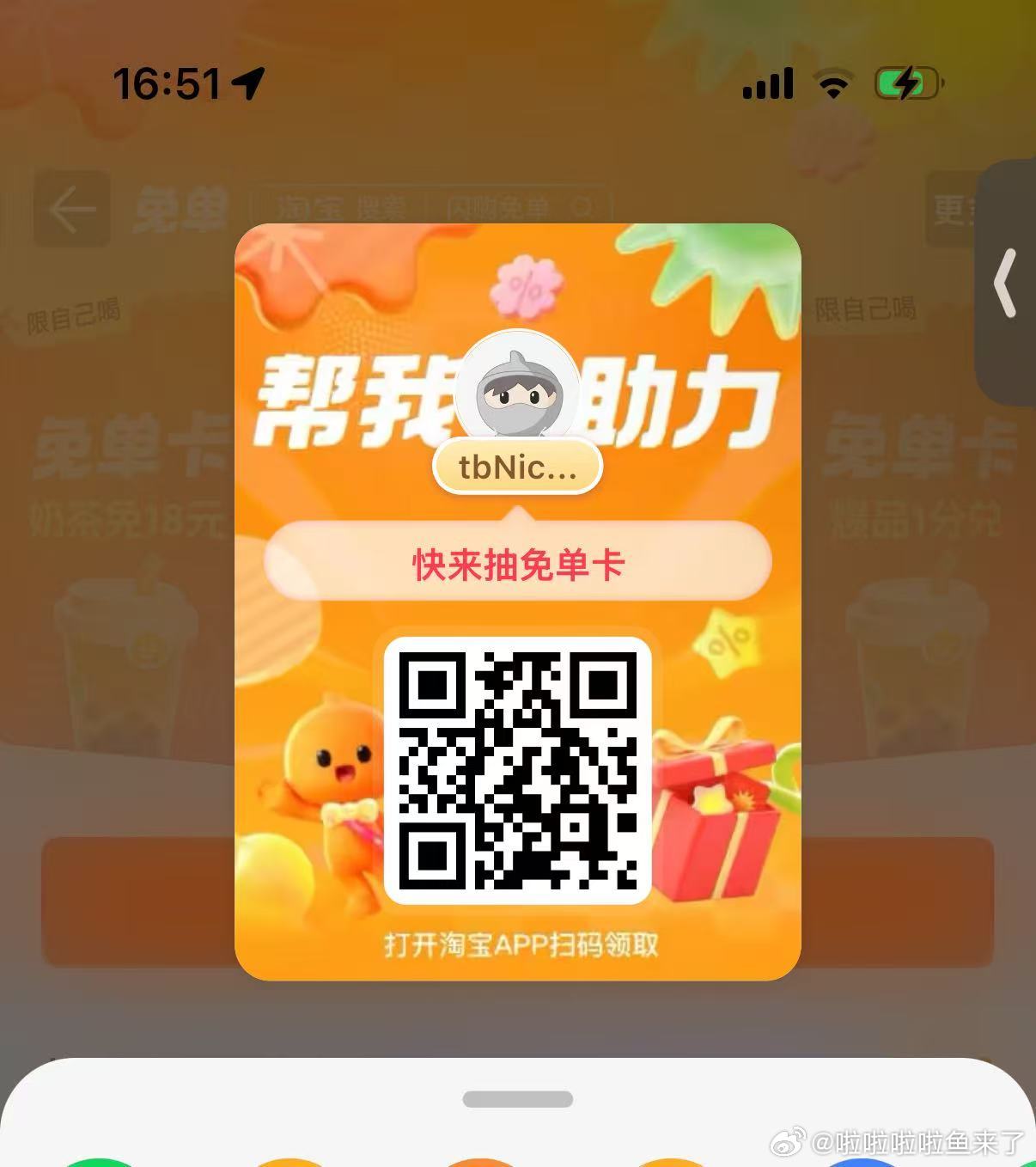 17点卡点抽奶茶 淘宝闪购app抽 ❗技巧: 整点前先扫别人的空码 等整点在页面抽即可哈 黑 号可通...