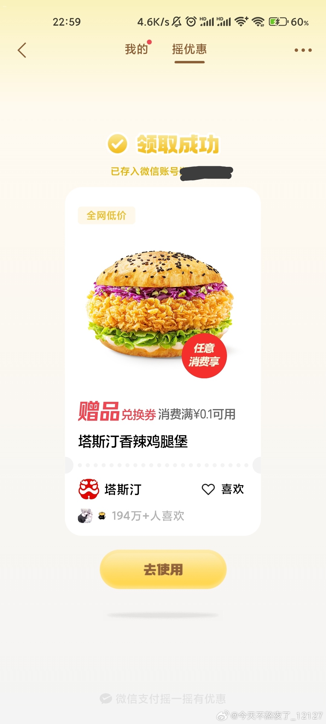 刚刚微信摇优惠中了塔斯汀汉堡![[打call] [打call]](https://face.t.sinajs.cn/t4/appstyle/expression/ext/normal/2a/moren_dacall_mobile.png)