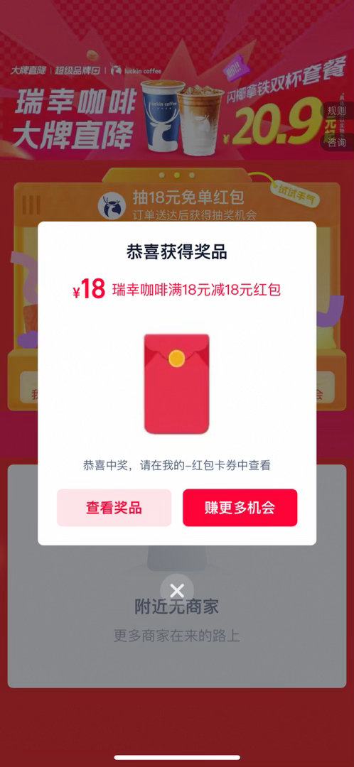 符合地区的 继续去试试 饿了么搜 大牌直降 如图横幅 去试抽9993份 瑞幸18-18红包 只限广...