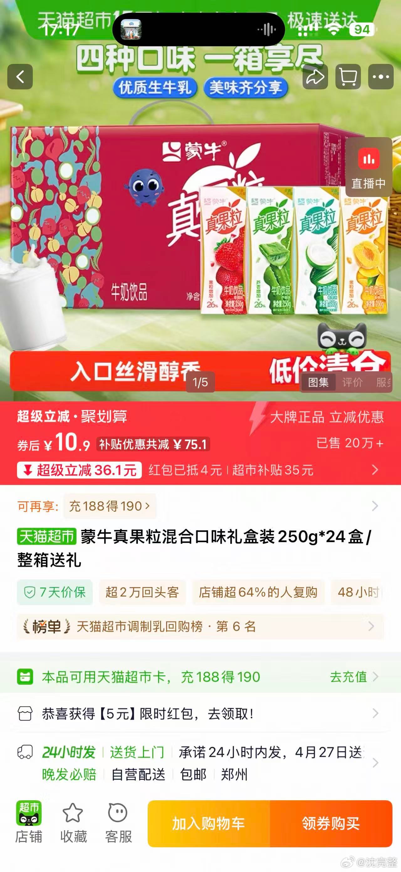🐱超 河南等地区有补贴35 蒙牛真果粒混合口味礼盒装250g*24盒 淘金币页面下单,拍1件【12....