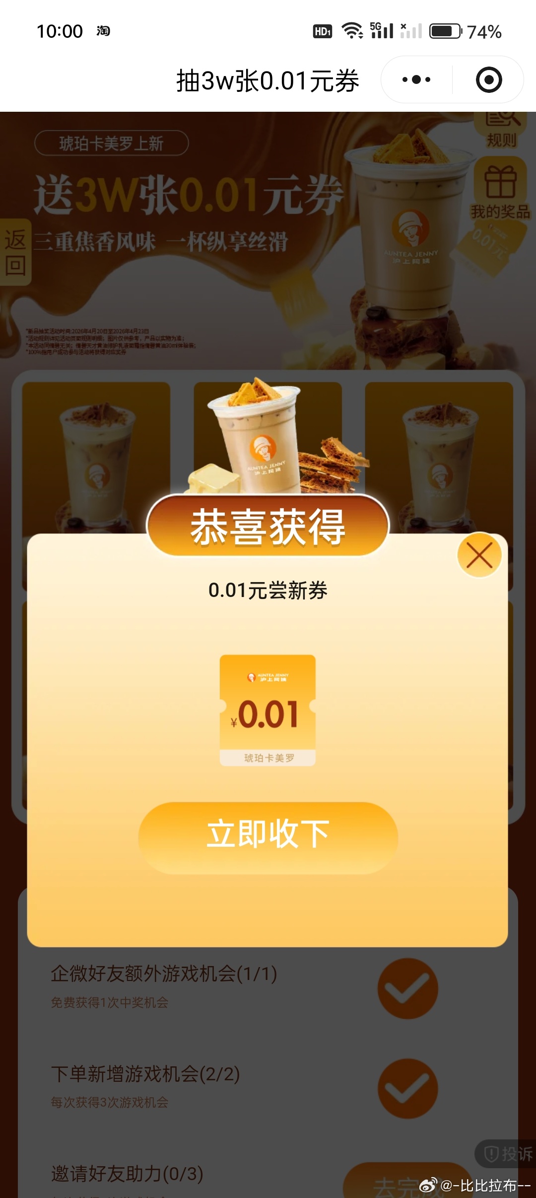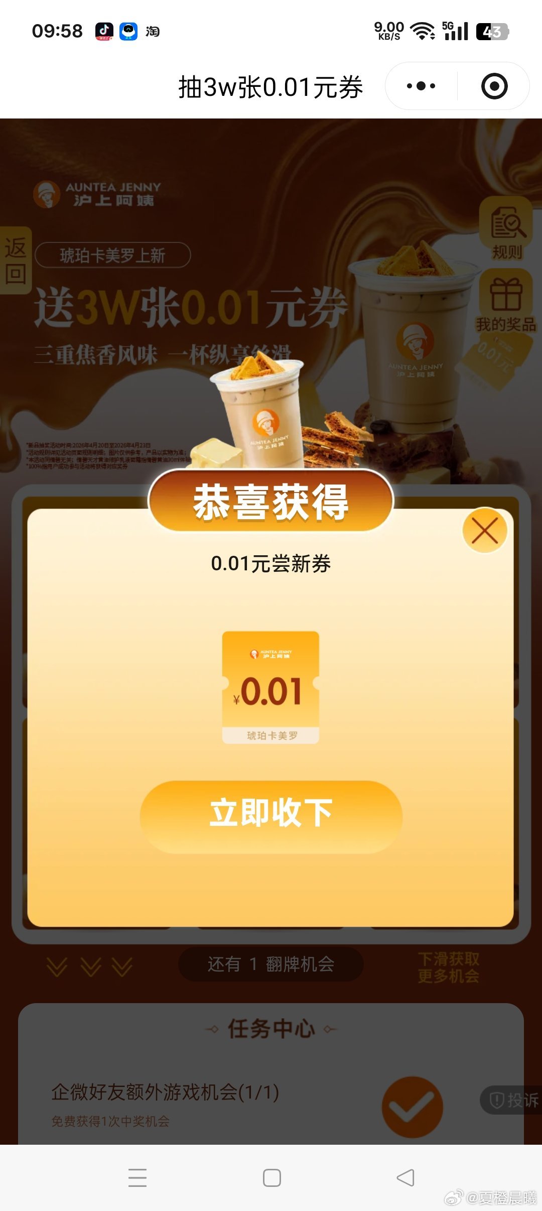 有反馈 沪上阿姨抽3w张1分喝