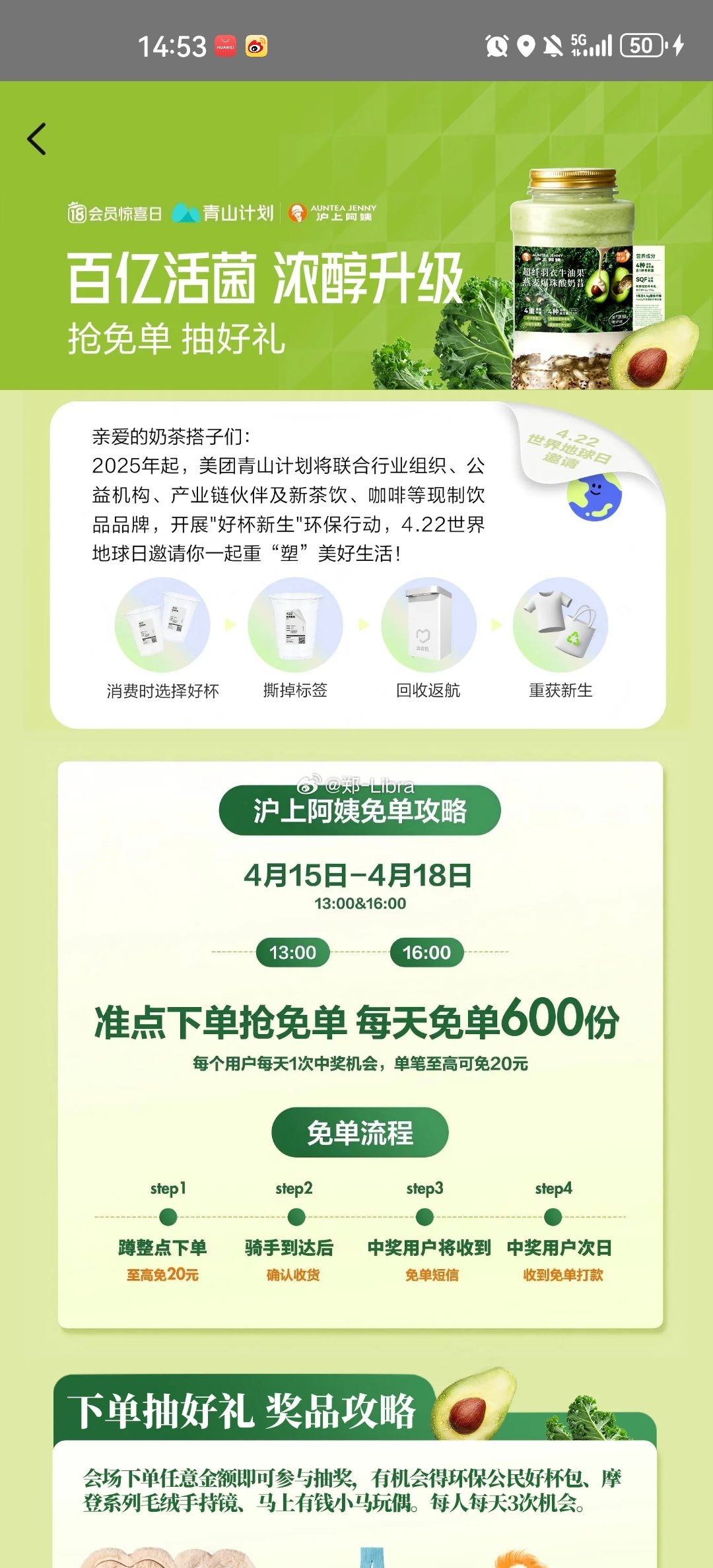 参与沪上兔单 记得领商家卷 美团【沪上阿姨】随机刚需冲! ⏰15点 沪上阿姨 一场1400名 最高2...