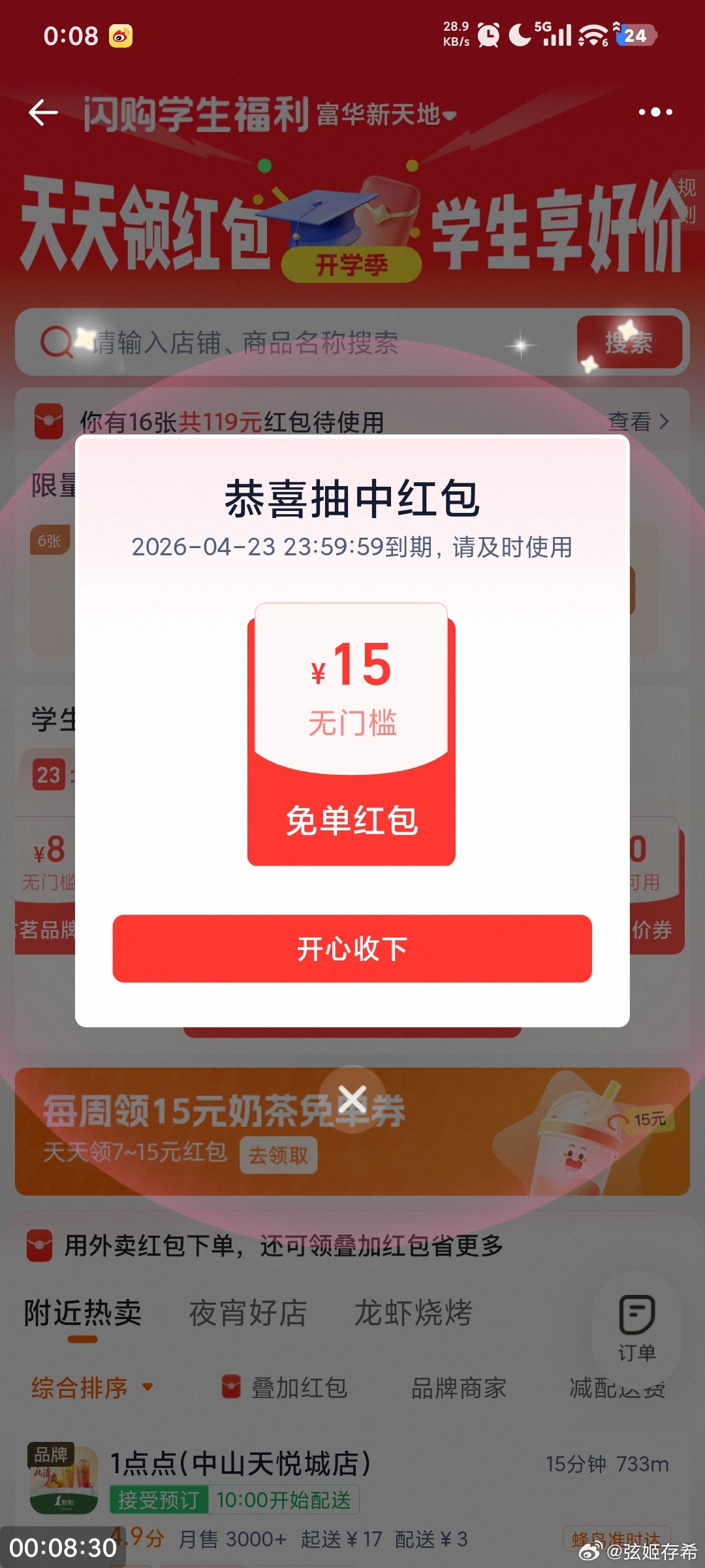 今天有也有反馈15 记得过下 ⭐淘宝闪购搜【6662】 中间「学生福.利」 横幅进 - ❶每周能领一...