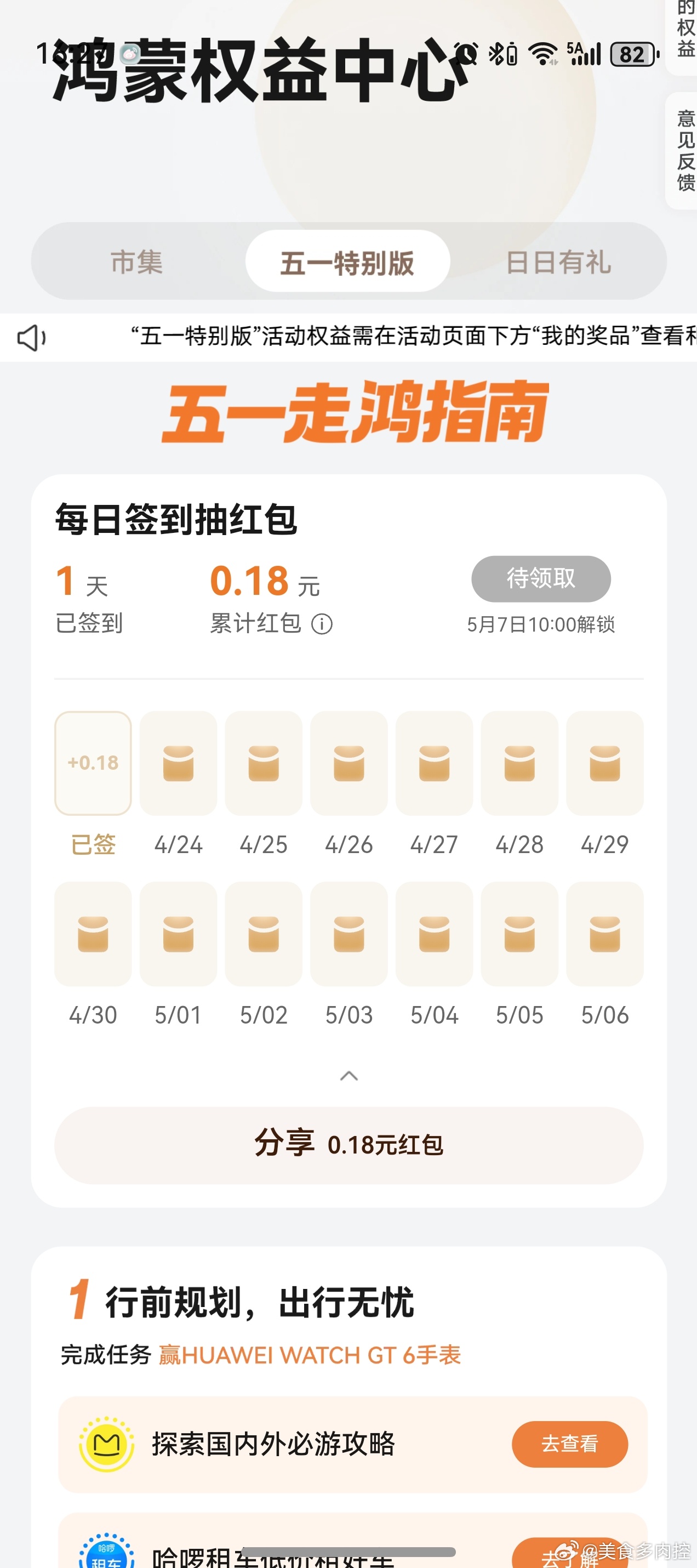 【华为鸿蒙五一每天签到领鸿包】 华为鸿蒙系统 负一屏“鸿蒙有礼” 五一特别版->每天签到领鸿包 ...