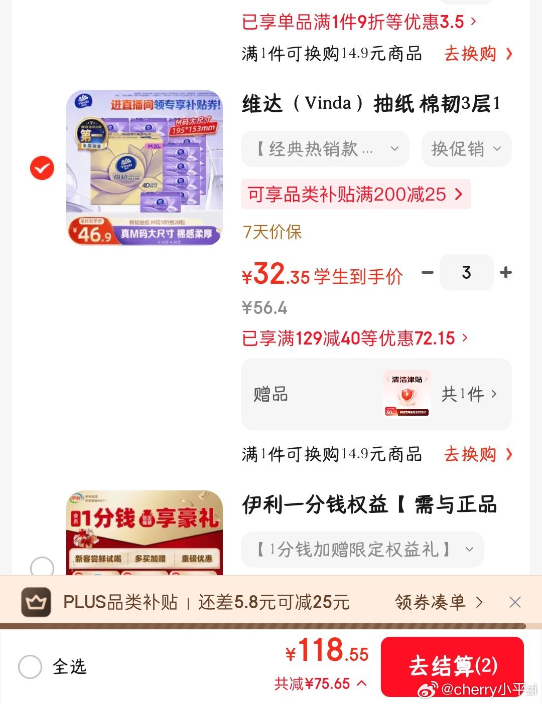🐶东 反馈 维达抽纸 棉韧3层100抽*20包 M码 拍3件凑后【60.81】返20元清洁津贴 凑单...
