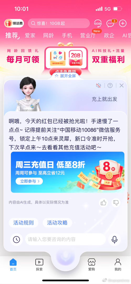 10点 移动app底部中间 灵犀 发送【充上就出发】 随机🉐话費加赠 记得早点去 ...