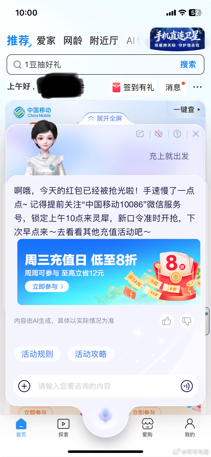 10点 移动αpp底部中间 灵犀 发送:充上就出发 随机🉐话費加赠 记得早点去 ...
