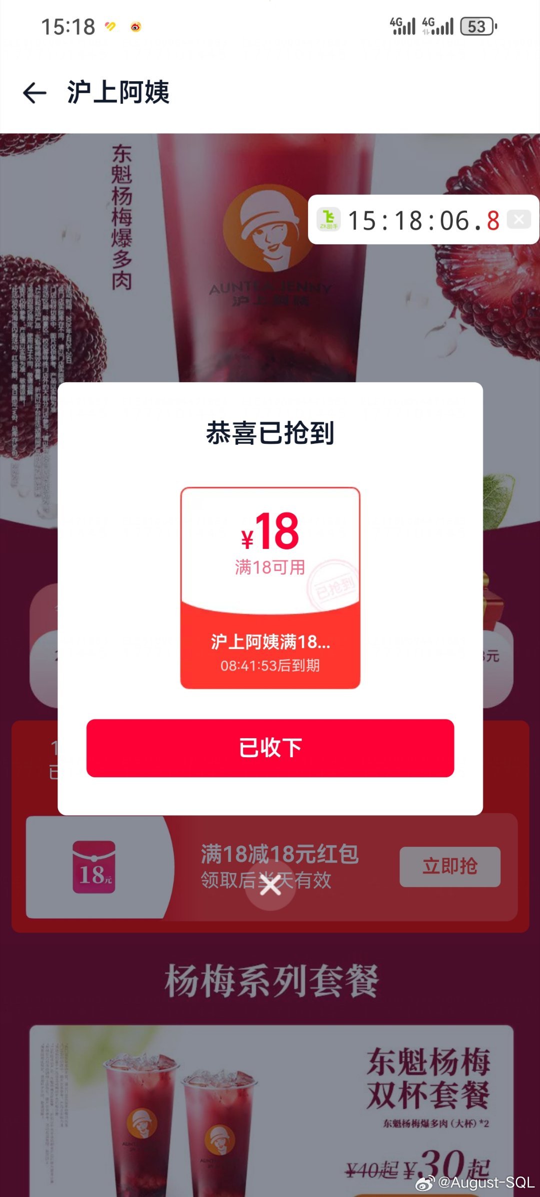 饿了么搜:沪上阿姨 横幅进 ⏰15:18 18:18 每场2500份18虹包 26截 👉mp://j...