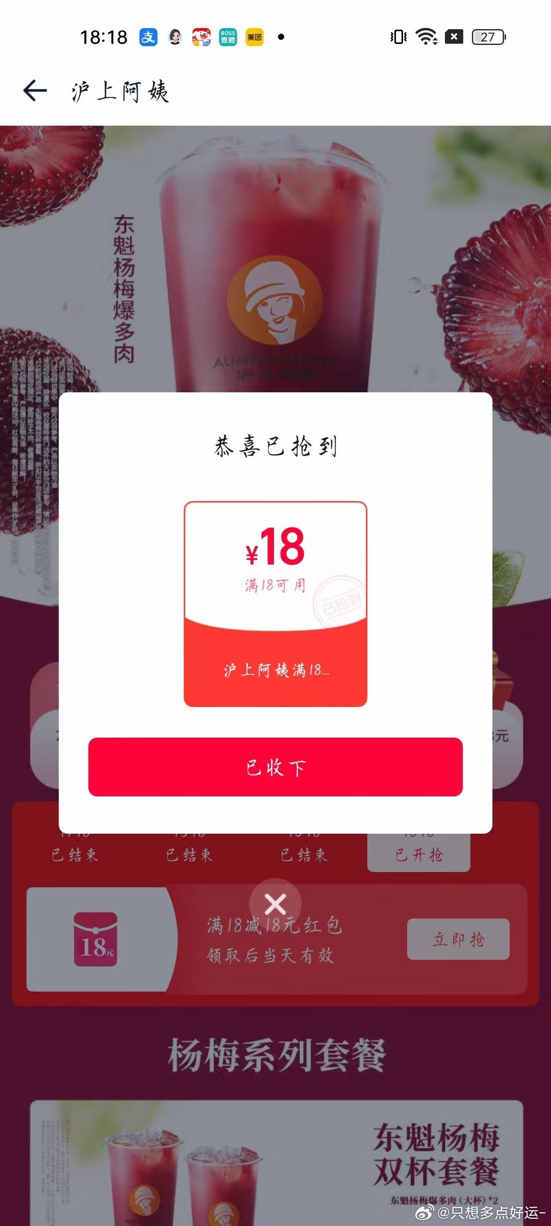 饿了么搜:沪上阿姨 横幅进 ⏰18:18 今天最后一场 每场2500份18虹包 26截 👉mp://...