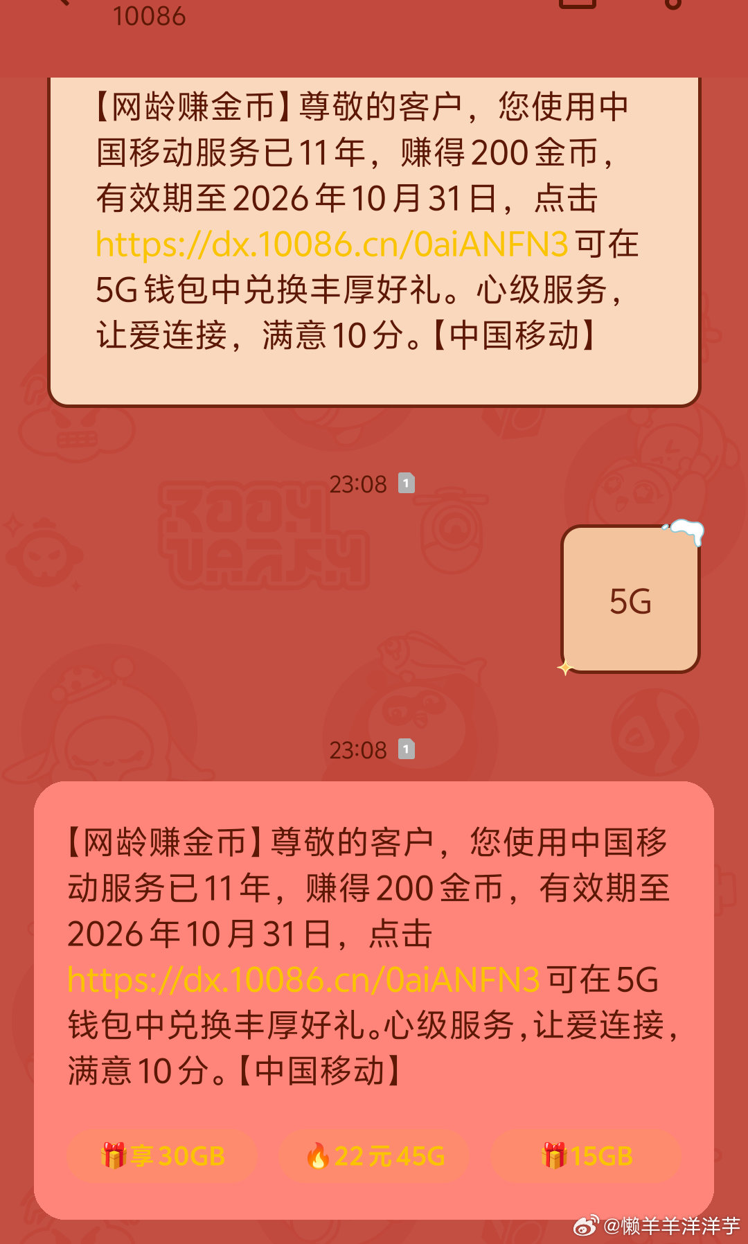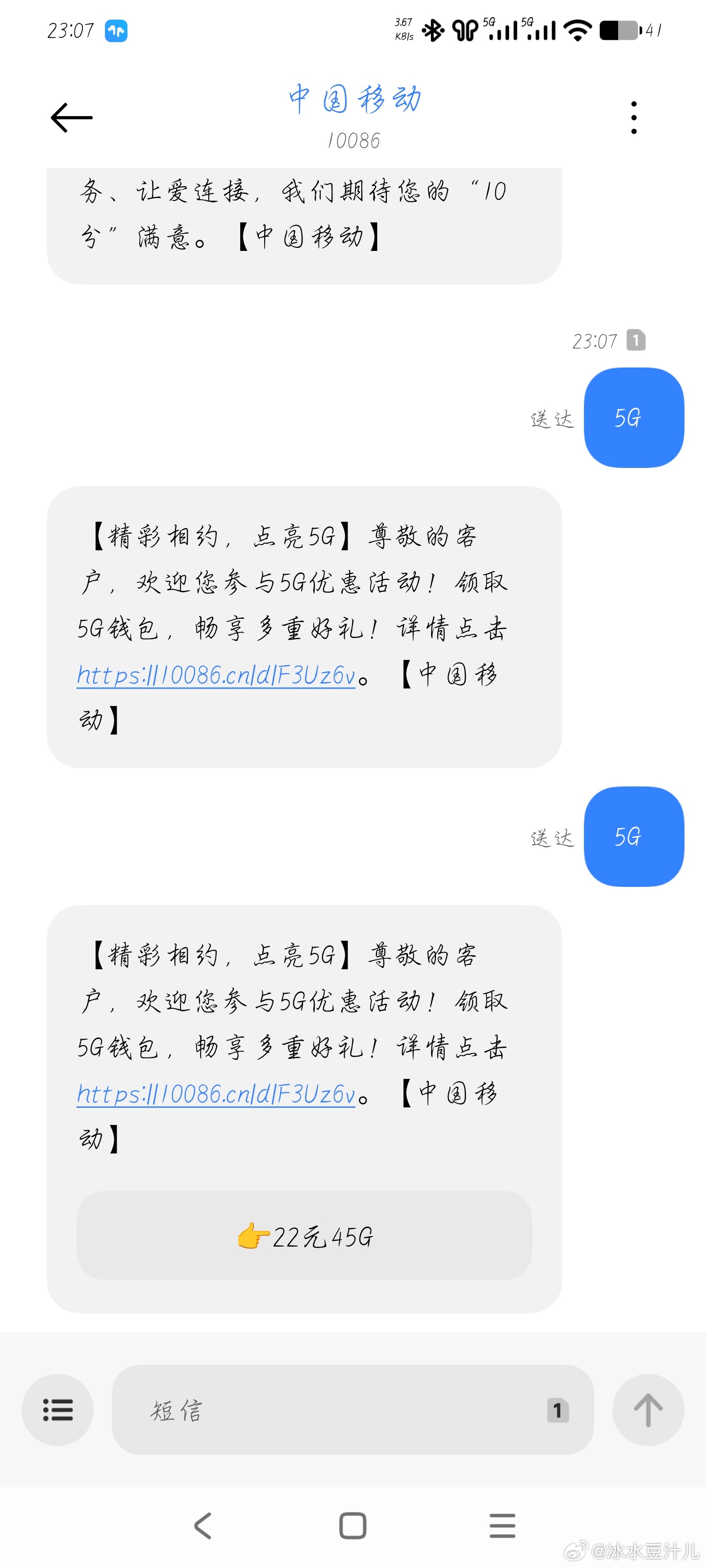 移动 给10086 发5g 有200i豆