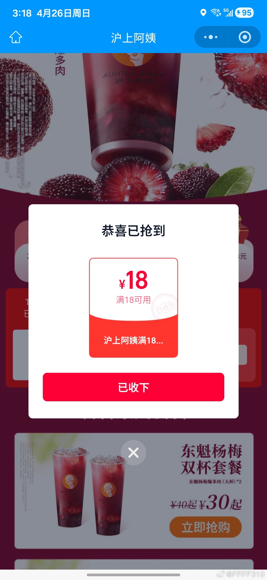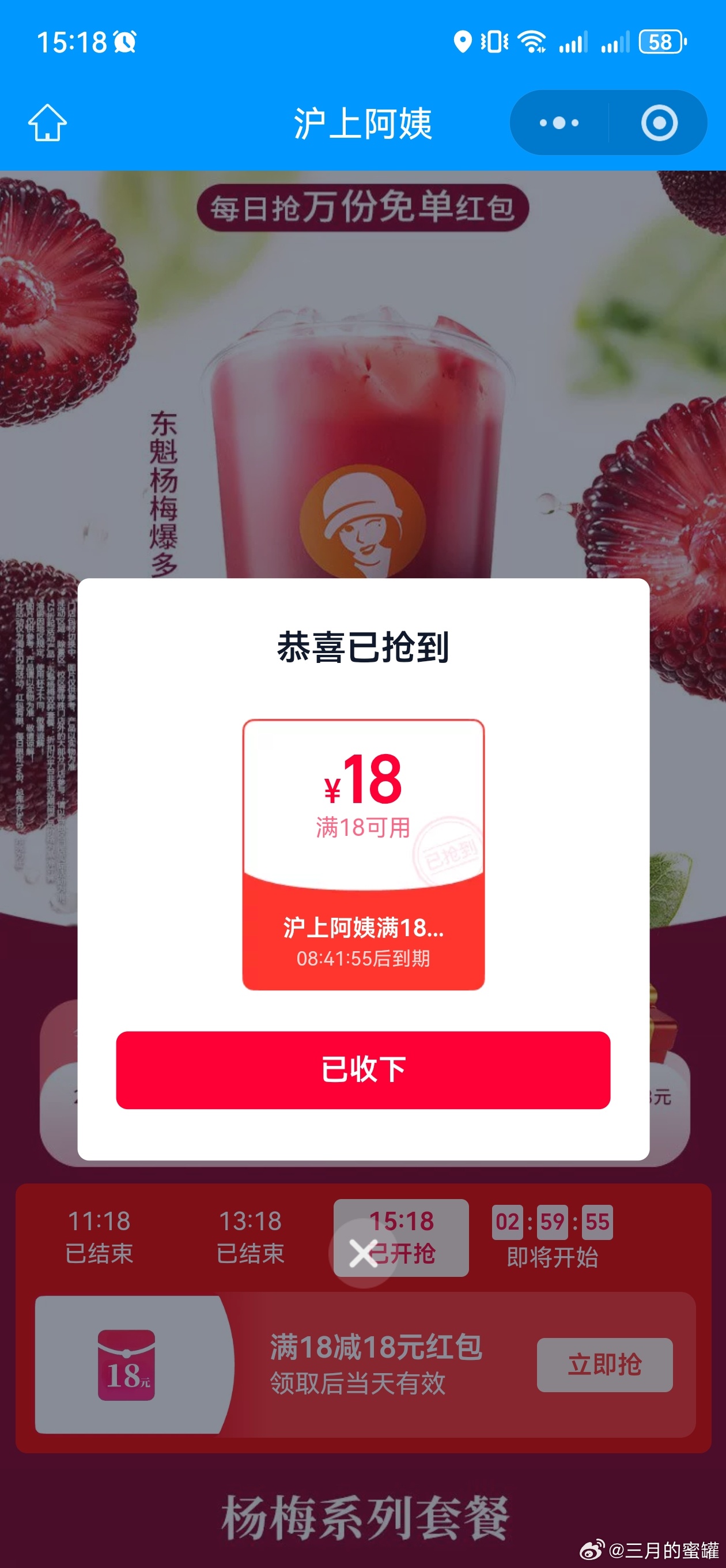 饿了么搜:沪上阿姨 横幅进 ⏰15:18 18:18 每场2500份18虹包 26截 👉mp://j...