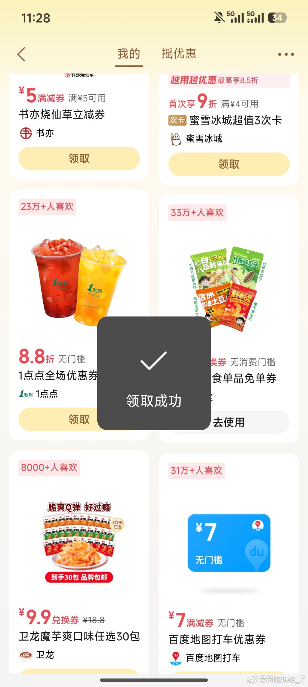 部分是益禾堂零食 或yh立减jin 每天随手过下 零点又有新次数 = #摇优惠 右下摇一摇 每天1次...