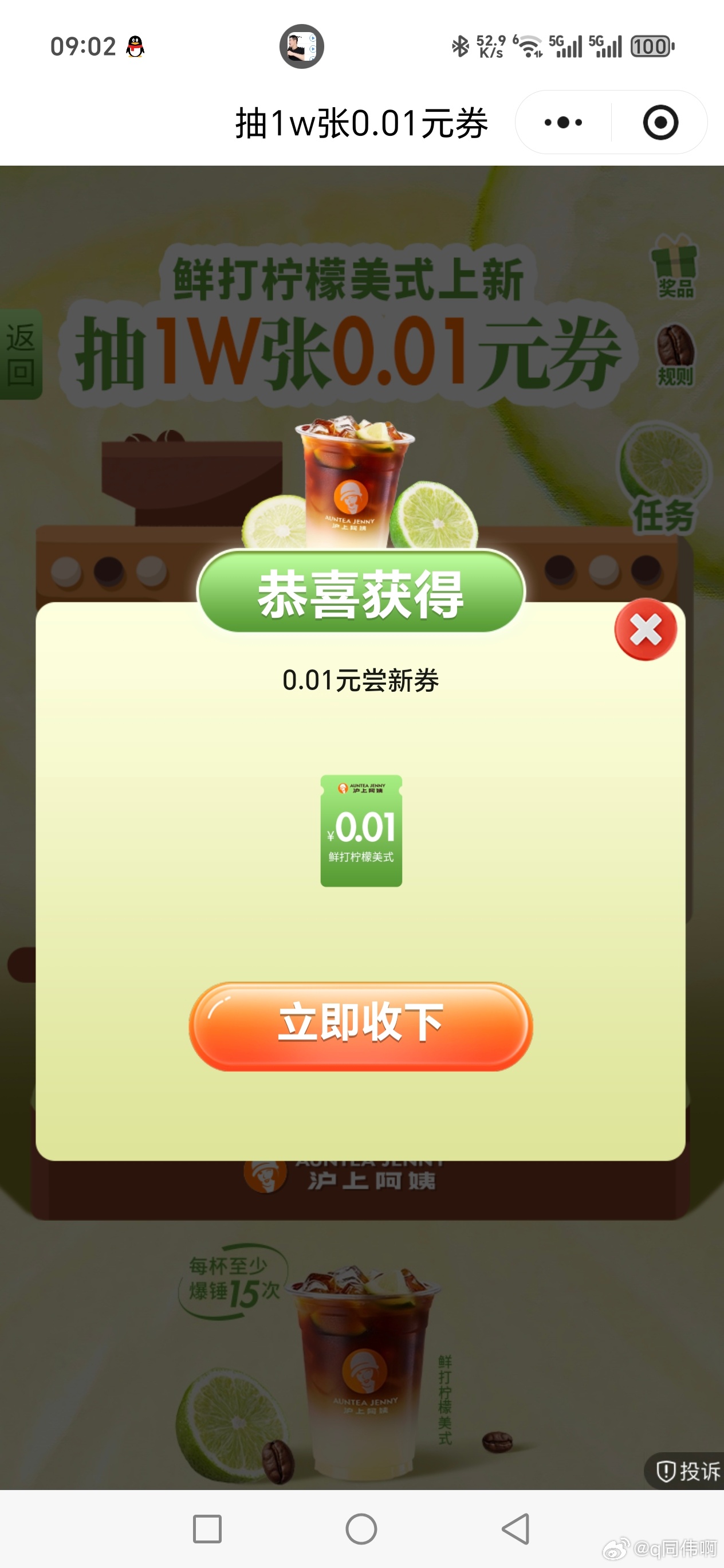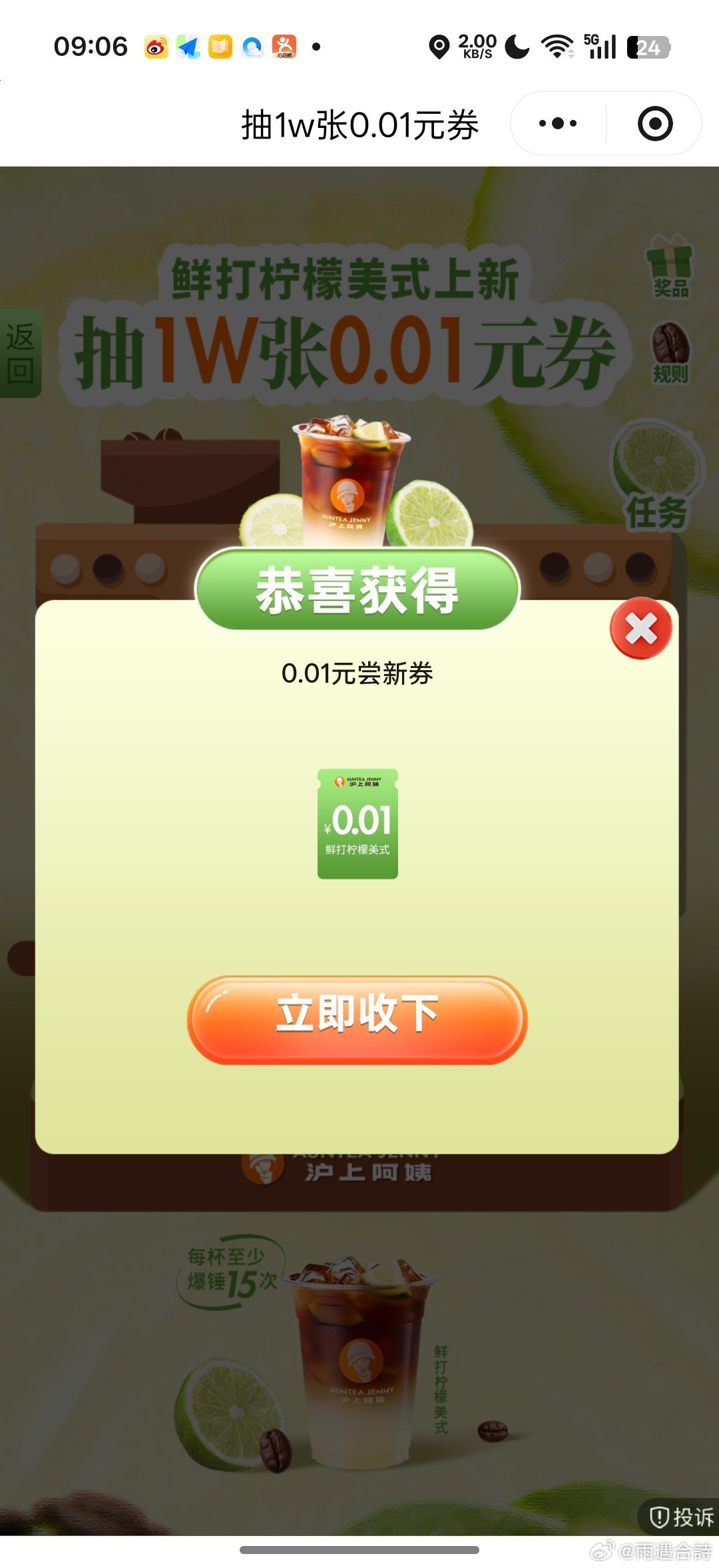 沪上阿姨 抽1w张0.01亓 1截 有反馈 去抽下 不中留次数 #小程序://沪上阿姨/AQskQJ...
