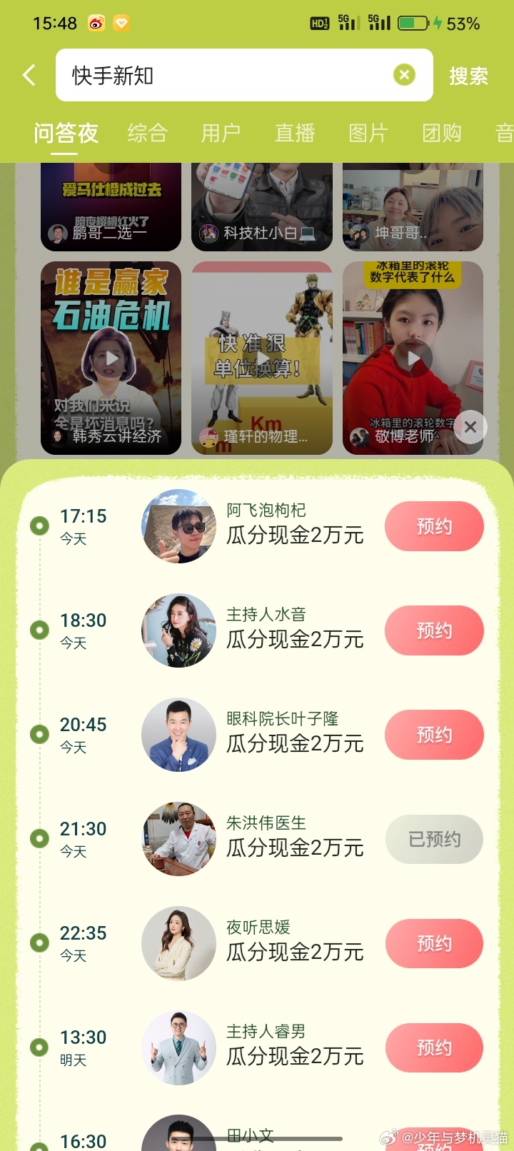 今日九场答题 记得来超哥直播间 ❶11:00 抖音极速版答题 ❷16:30快手状元(田小文) ❸17...