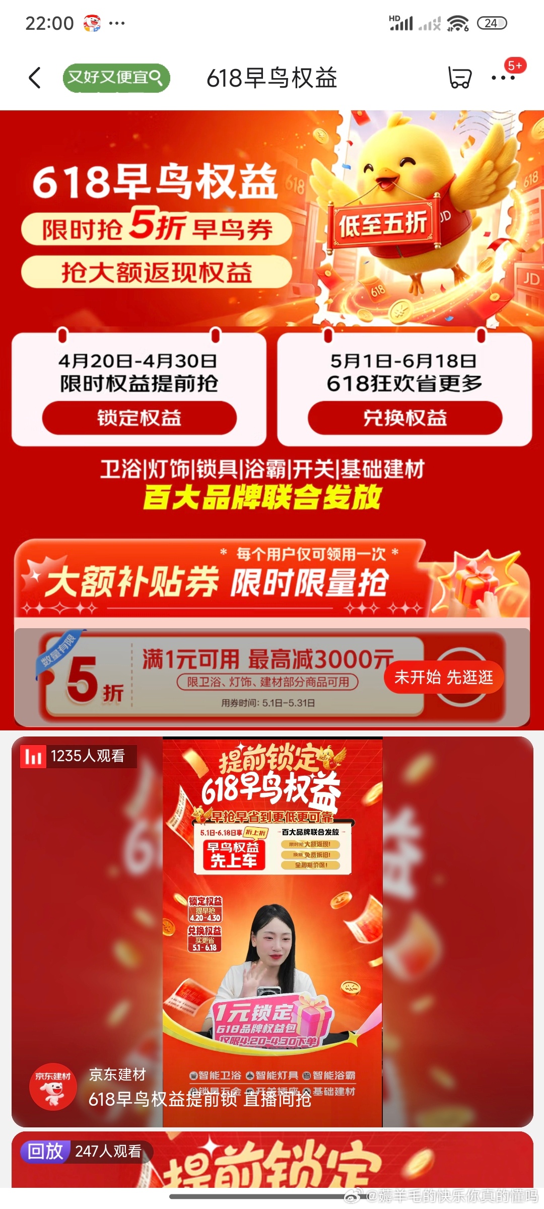 【22点】 建材5折券 京东外卖29-20券 淘宝闪购抽爆红包...