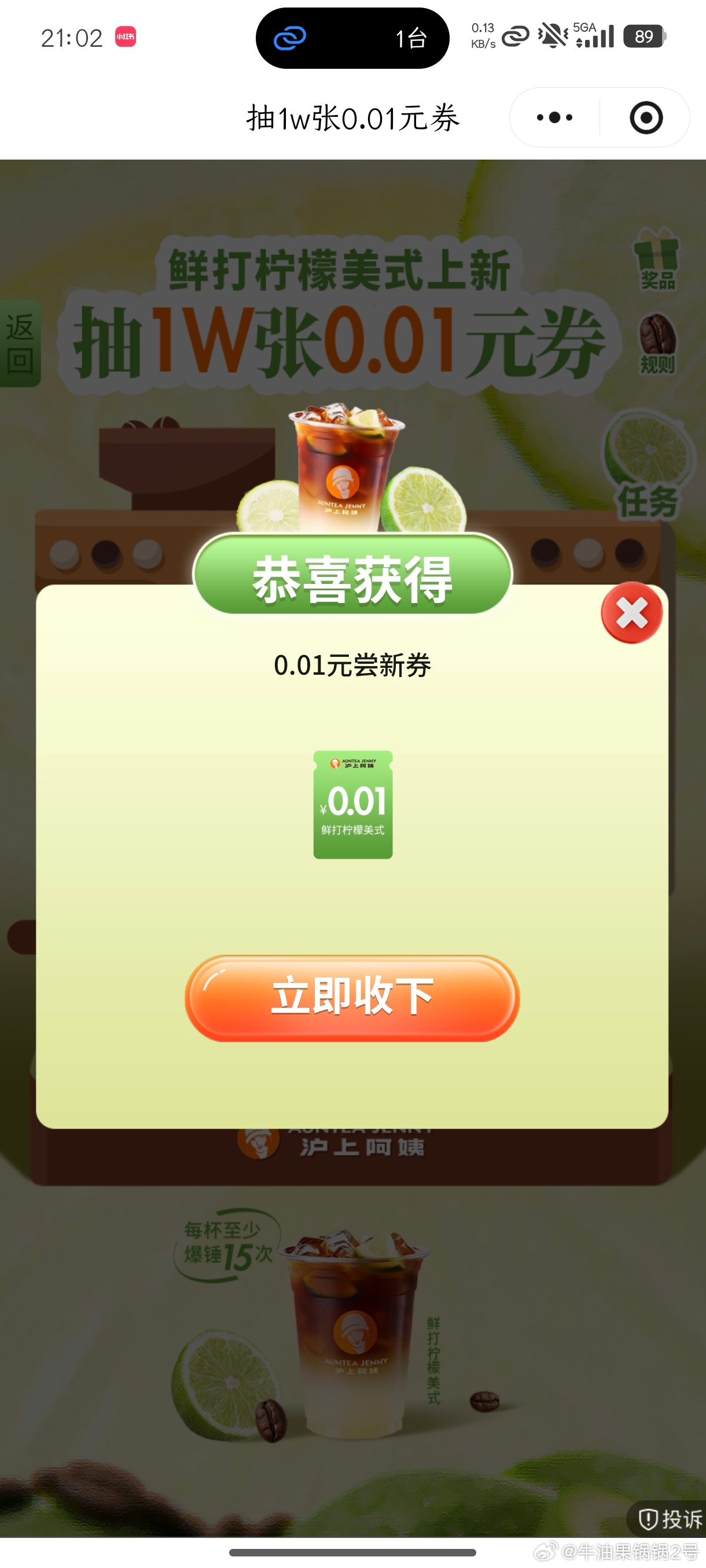 沪上阿姨 抽1w张0.01亓 1截 小反馈 火爆左滑卡进去就行 #小程序://沪上阿姨/AQskQJ...