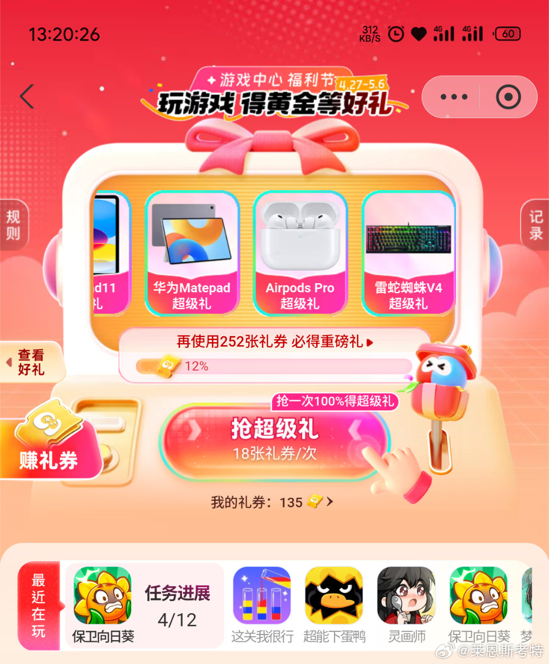 zfb【游戏中心】288张重磅礼 目前是全天随机中 不用卡0都行 ...