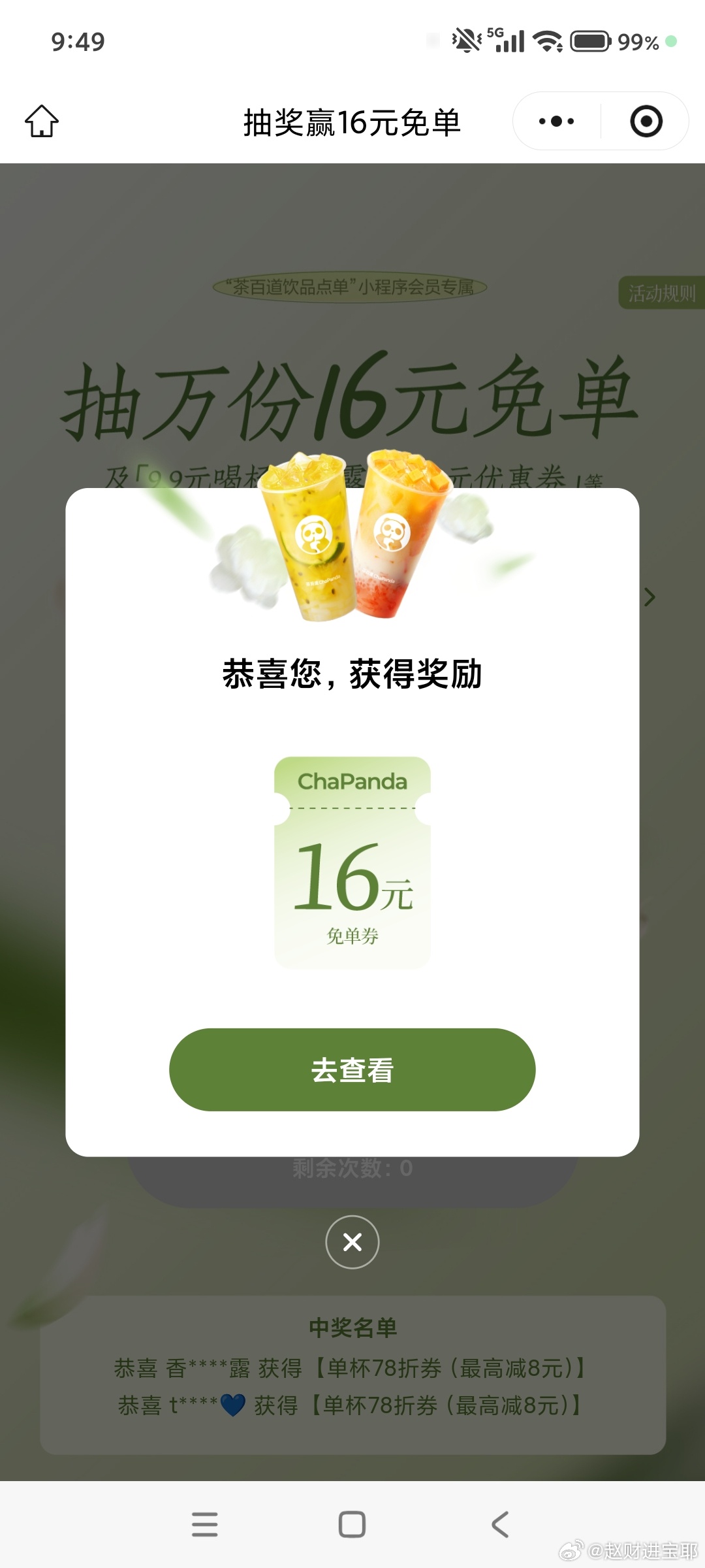 茶百道抽1w份兔单 认16倦 还有反馈 每天1次 概lv可能小 #小程序://茶百道饮品点单/nGU...